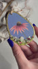 One of a kind hand-painted ornament. Acrylic on wood with a satin varnish. Embellished with Rose Quartz, Sunstone, Abalone Shells, Gold Pyrite, dried moss and rhinestones.