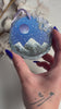 One of a kind hand-painted ornament. Acrylic on wood with a satin varnish. Embellished with Moonstone and Clear Quartz.