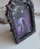 Mini original acrylic painting on recycled watercolor black cotton rag paper. Painting is in an ornate frame without glass. Frame has been hand-painted and is embellished with Snowflake Obsidian and Rainbow Silica Carbide flakes.