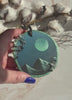 One of a kind hand-painted ornament. Acrylic on wood with a satin varnish. Embellished with Clear Quartz and Rainbow Carbide flakes.