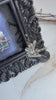 Mini original acrylic painting on recycled watercolor black cotton rag paper. Painting is in an ornate frame without glass. Frame has been hand-painted and is embellished with Clear Quartz and Gold Pyrite.
